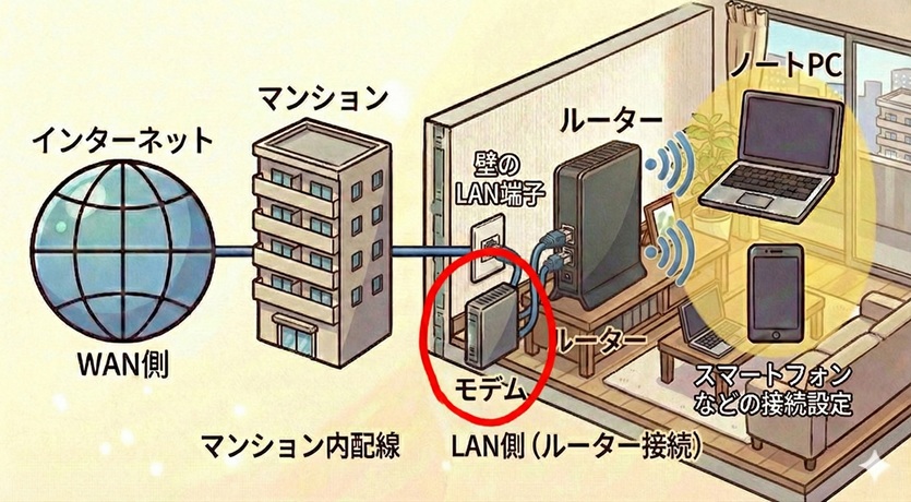 このタイプの人: マンションで個別にネット契約をしています。壁にある「電話の穴」や「光の穴」から、一度「小さな箱(VDSLモデムなど)」を通してからルーターに繋がっているタイプです。