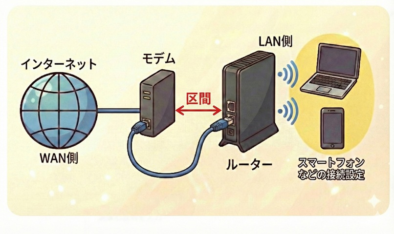 青い穴(WAN)から出ている「線」を指でたどってみてください。その先はどこに繋がっていますか?